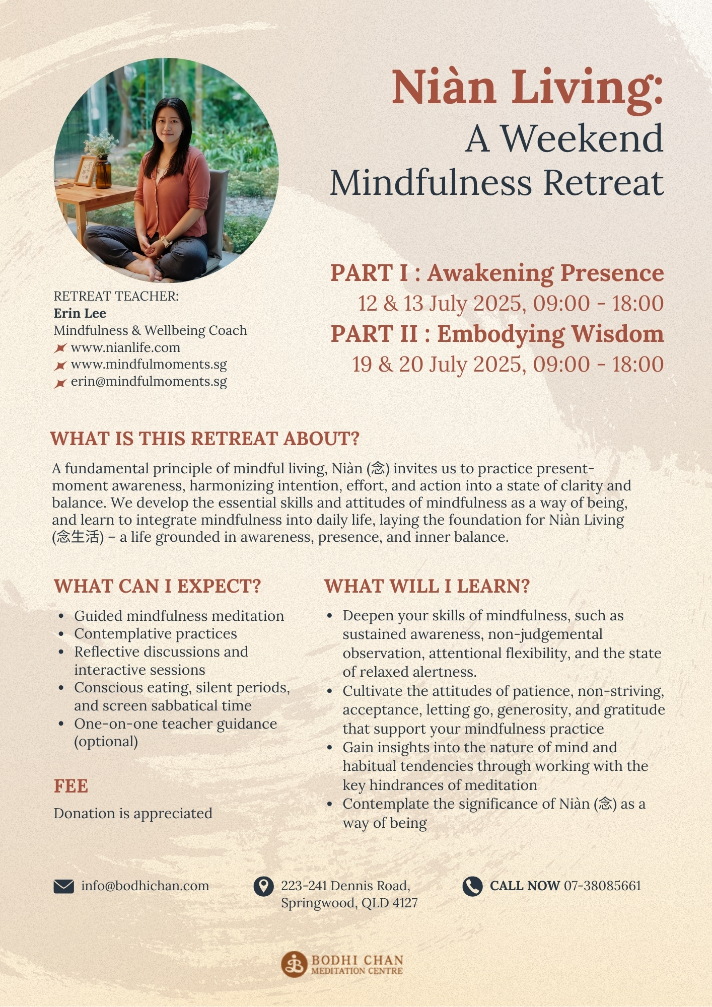 Nian Living: Weekend Mindfulness RetreatDiscover the Power of Presence with Niàn Living: A Weekend Mindfulness Retreat Ready to slow down, reconnect, and deepen your mindfulness practice? Join Erin Lee, Mindfulness & Wellbeing Coach, for a transformative weekend retreat at Bodhi Chan Meditation Centre in Springwood, QLD.